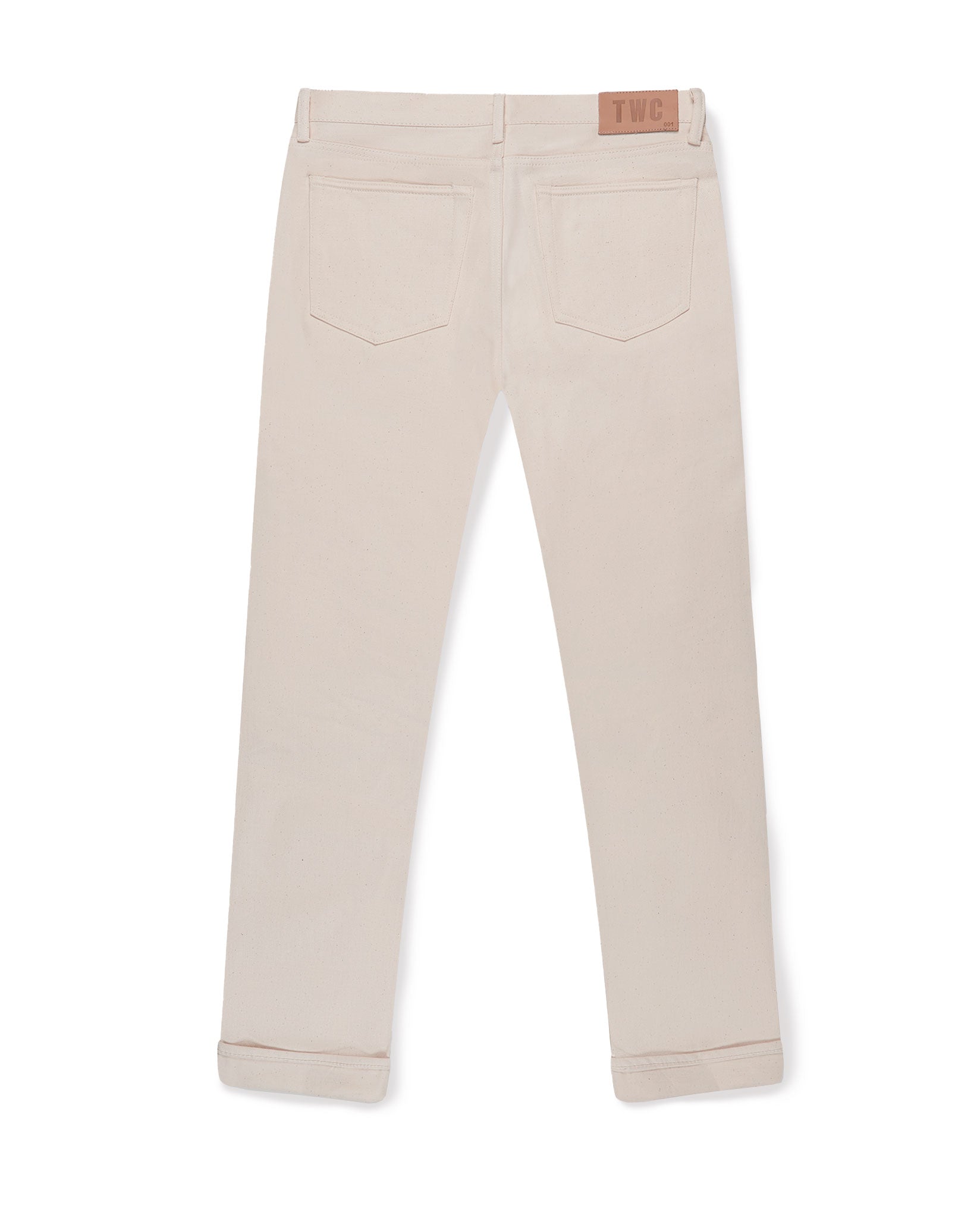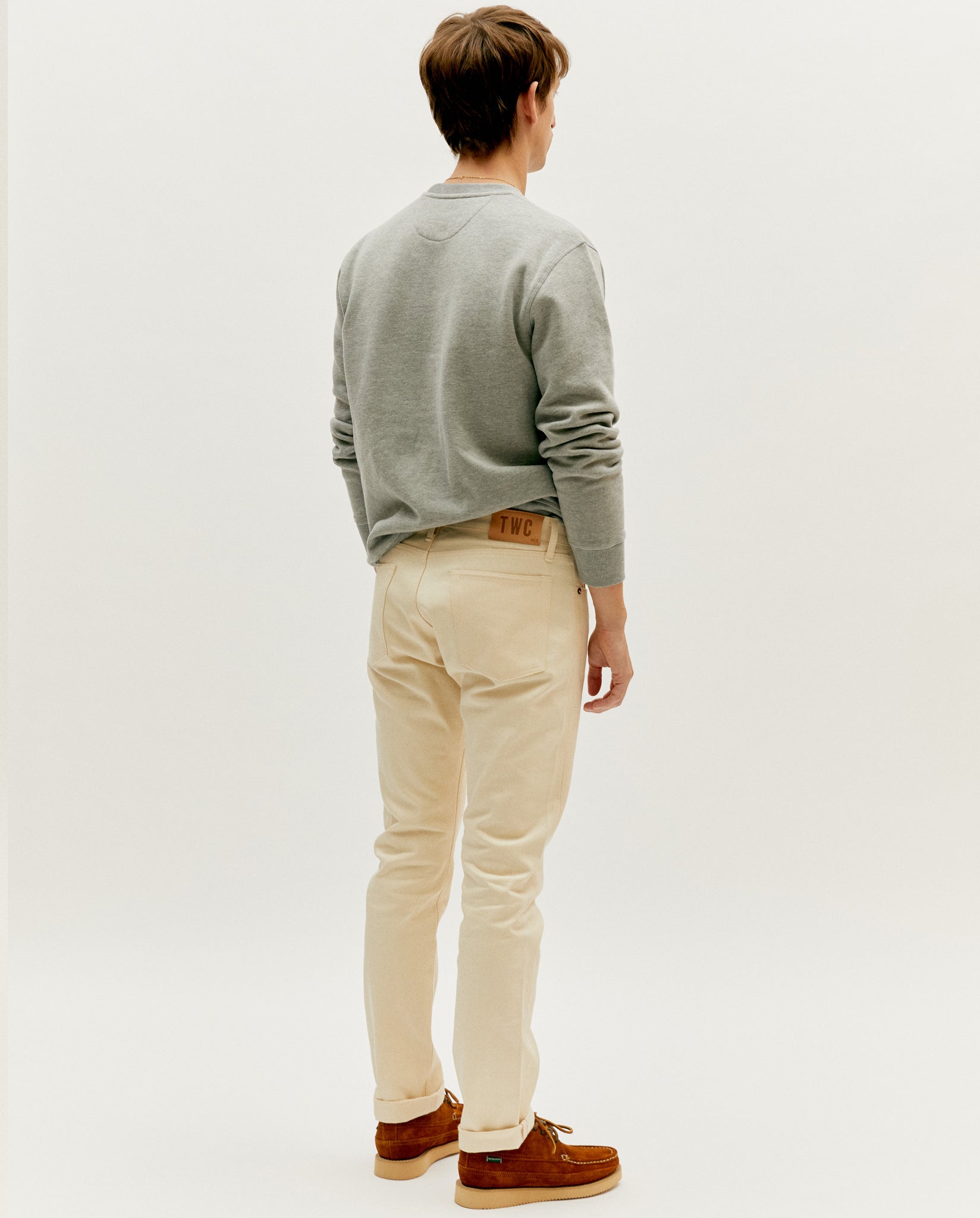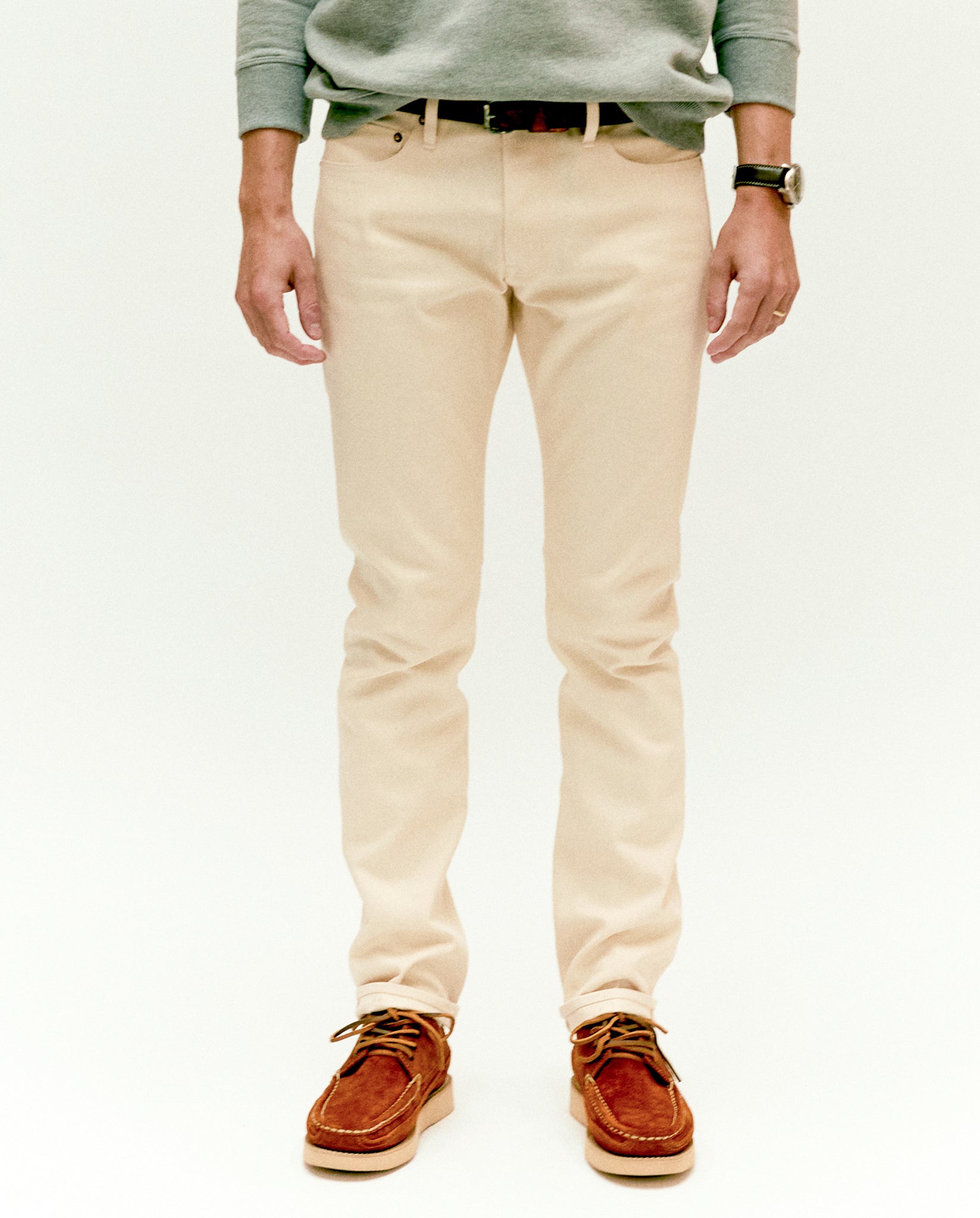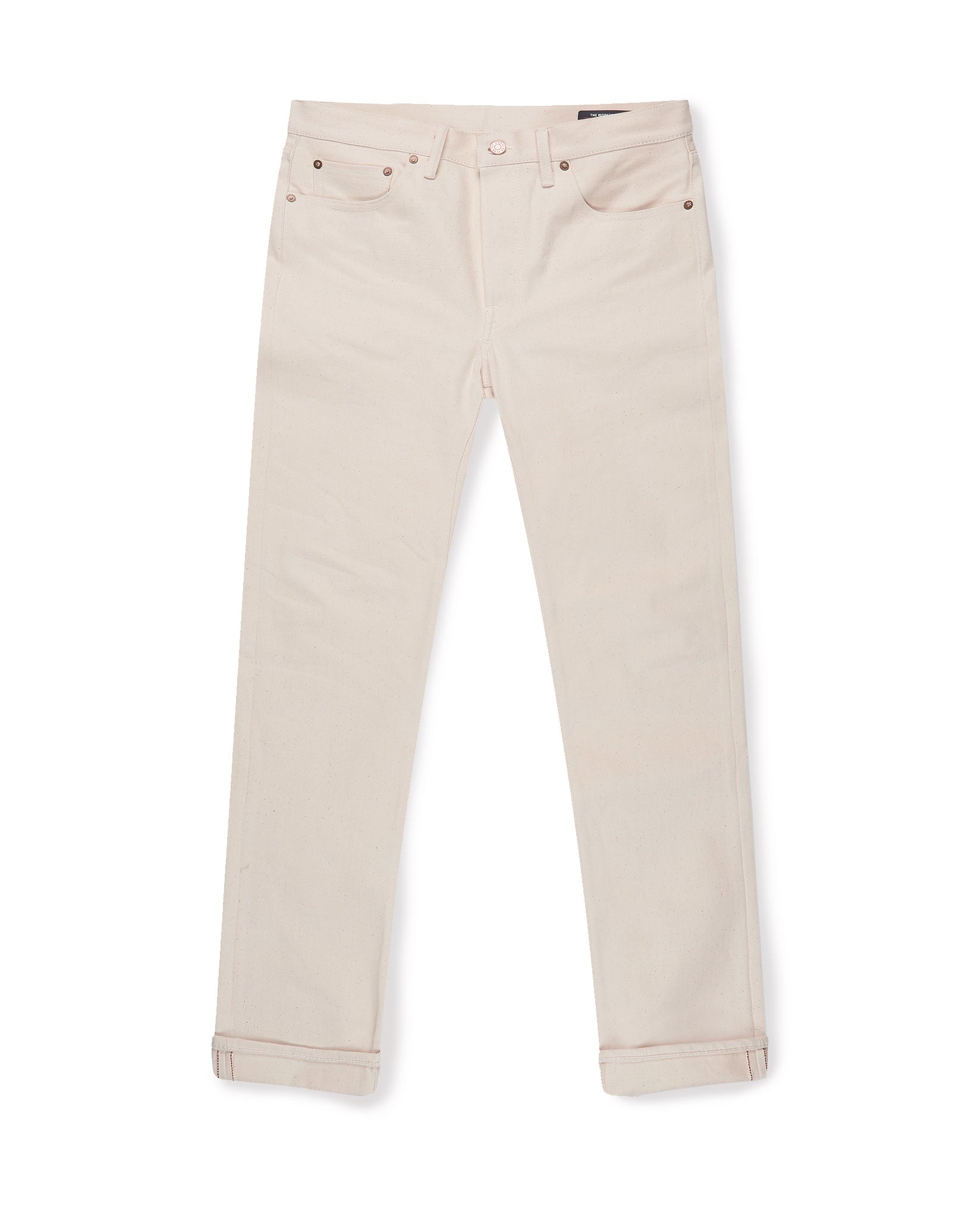 Made from narrow loom 12oz ecru denim and woven by the famed Collect Japanese mill. Our raw ecru slim fit 001 jean comes in a flattering and modern fit. This ecru denim hue has subtle natural flecks with no treatments or bleaching for a unique finish.