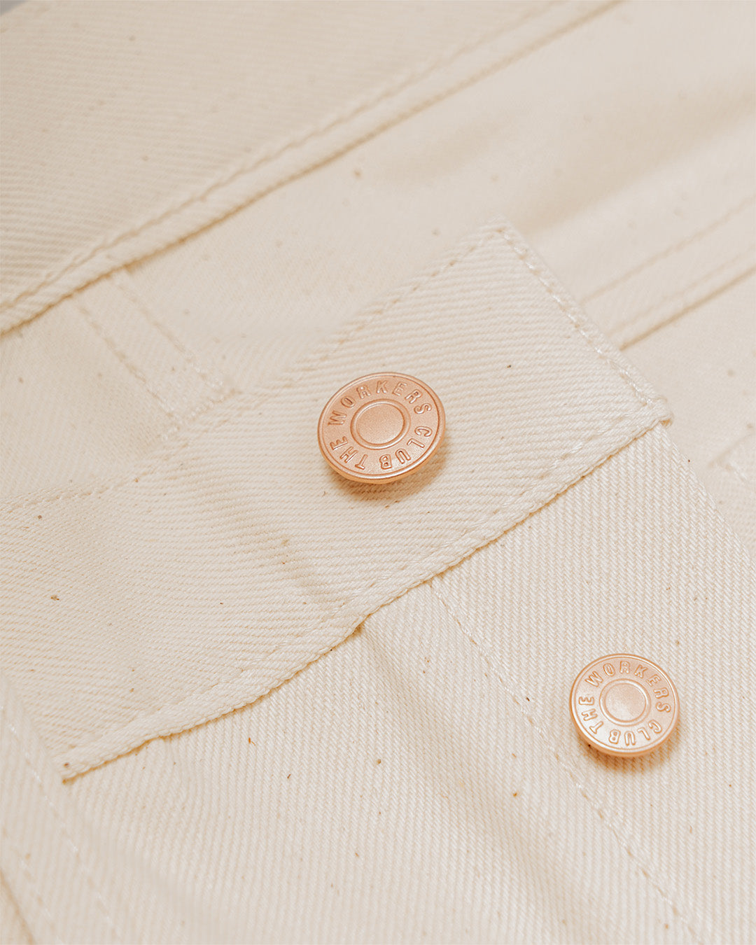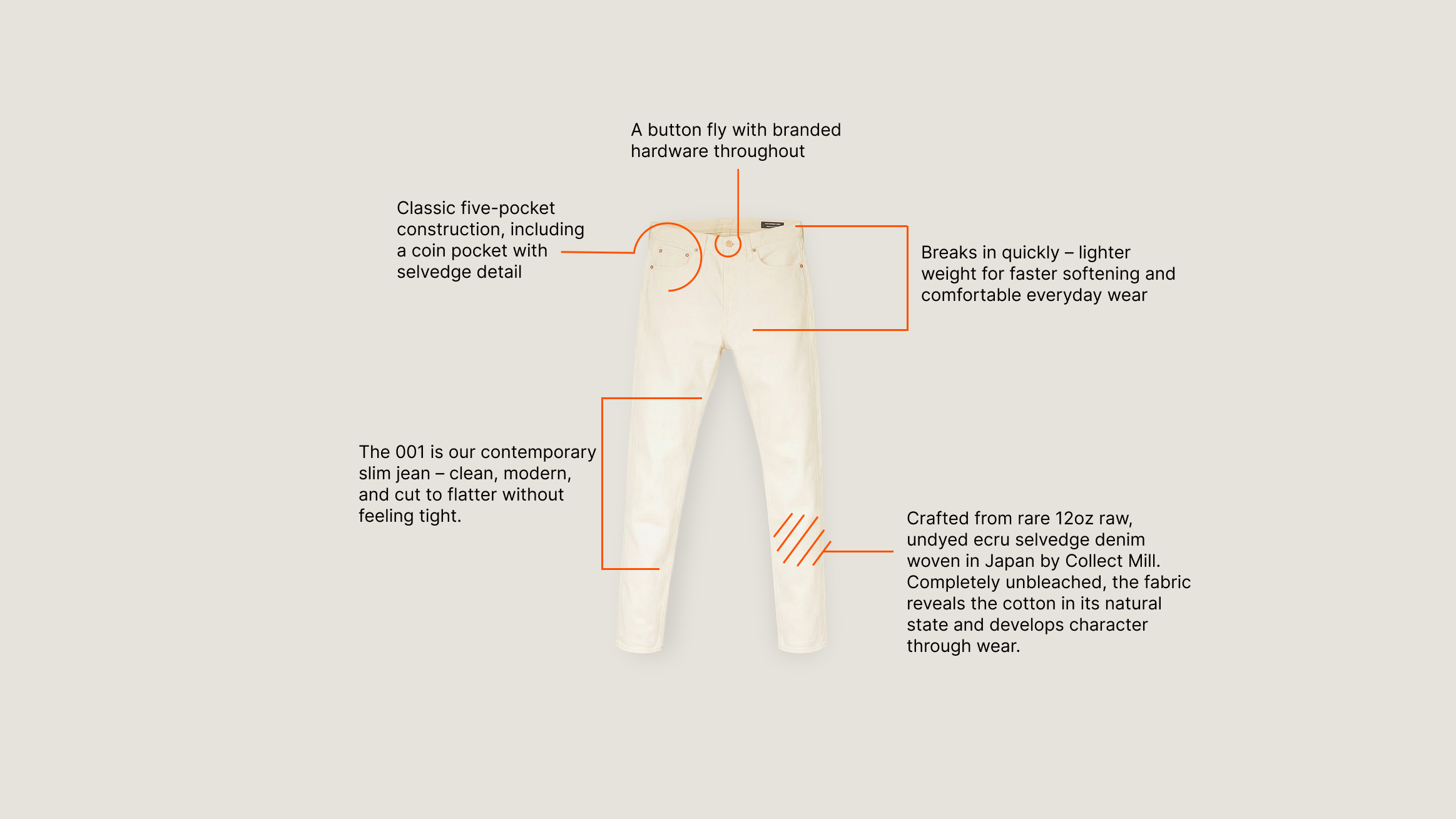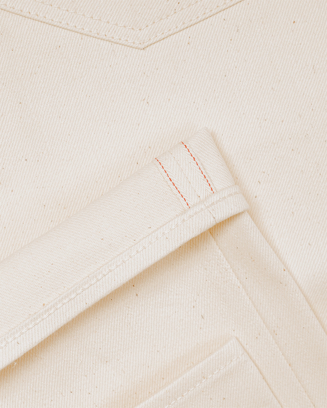 - 12oz raw ecru selvedge denim – woven on narrow looms by Collect Mill in Okayama, Japan