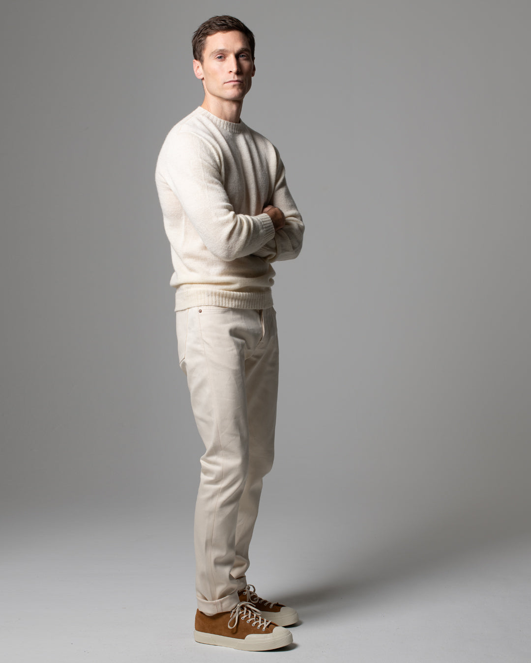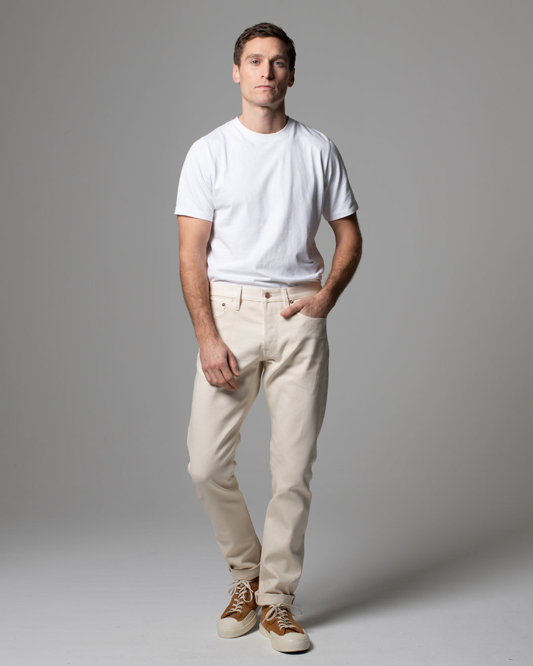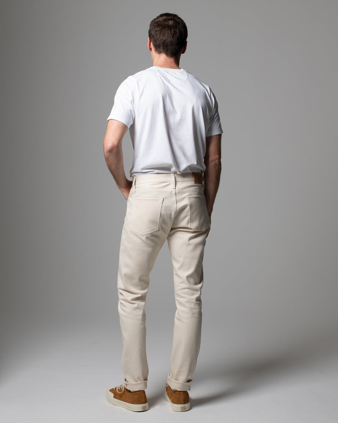 Our 001 slim fit jean is a flattering and modern cut. This exclusive ecru denim hue has subtle flecks in the cotton with no treatments or bleaching for a unique natural finish.