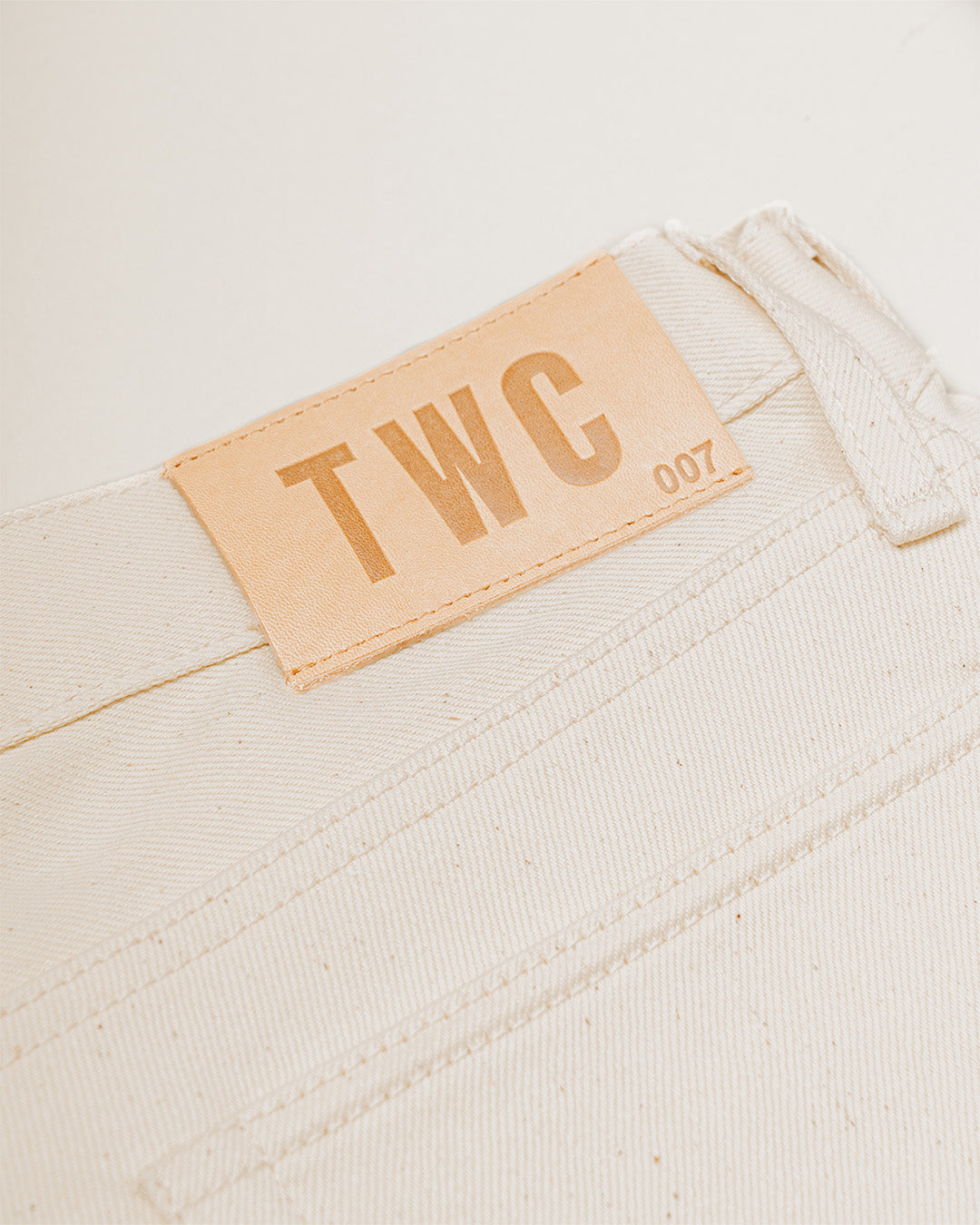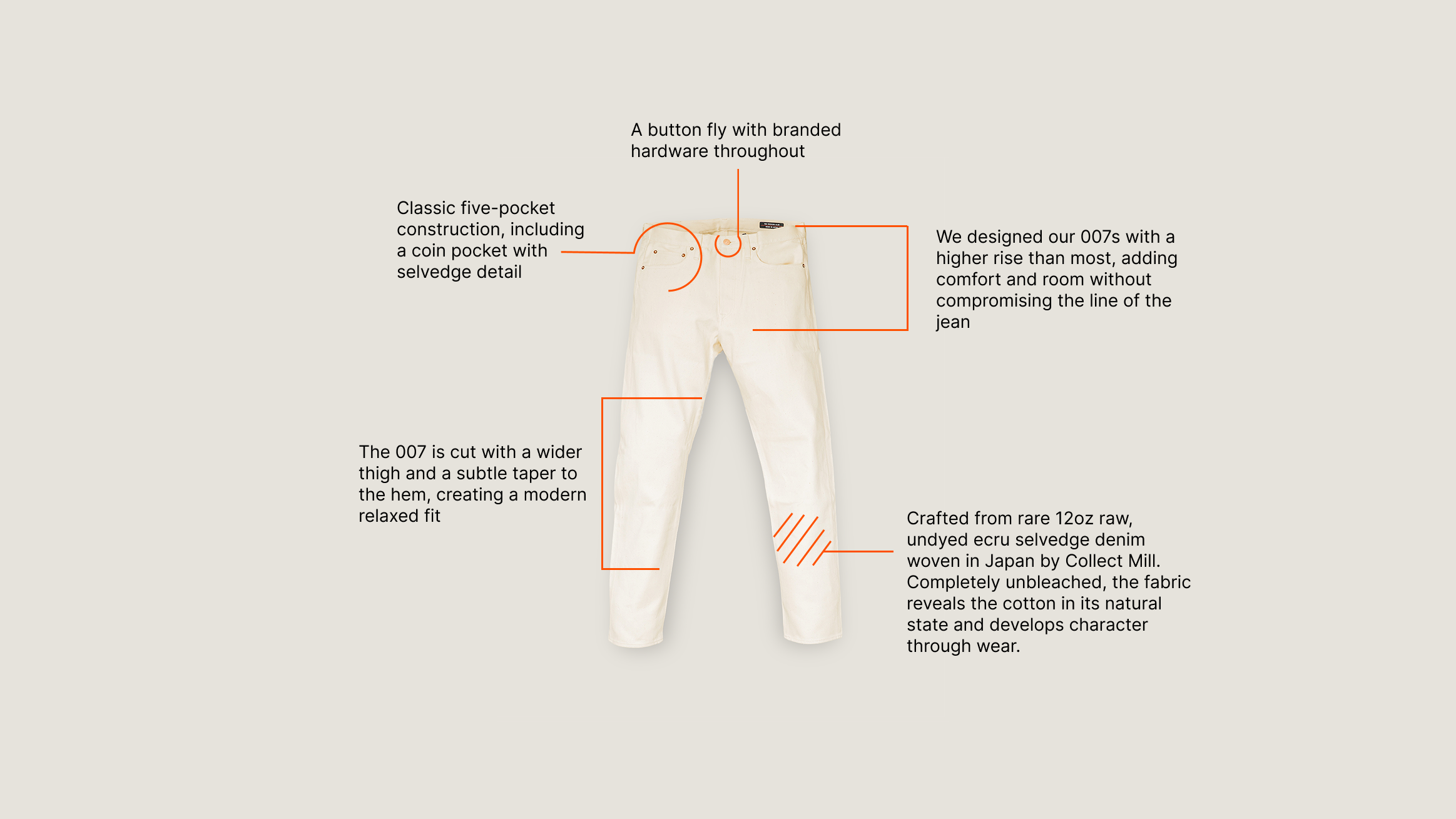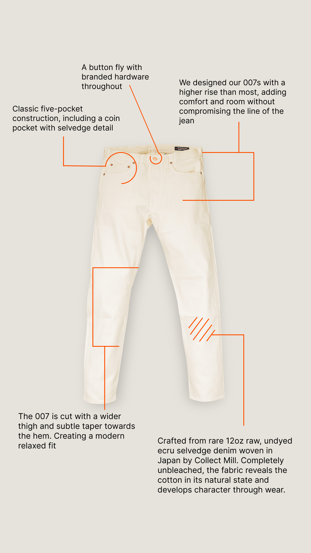 The 007 is our relaxed-fit, slightly higher-rise jean — designed for comfort without compromising on clean, considered lines. Cut from rare 12oz raw, undyed ecru selvedge denim, woven on narrow shuttle looms in Japan by Collect Mill, the fabric is left completely unbleached to reveal the cotton in its most natural state — subtle shade variation and visible slubs included. Lighter in weight than our indigo and black styles, it feels crisp at first but softens and moulds to you quickly, developing character through wear rather than fading.