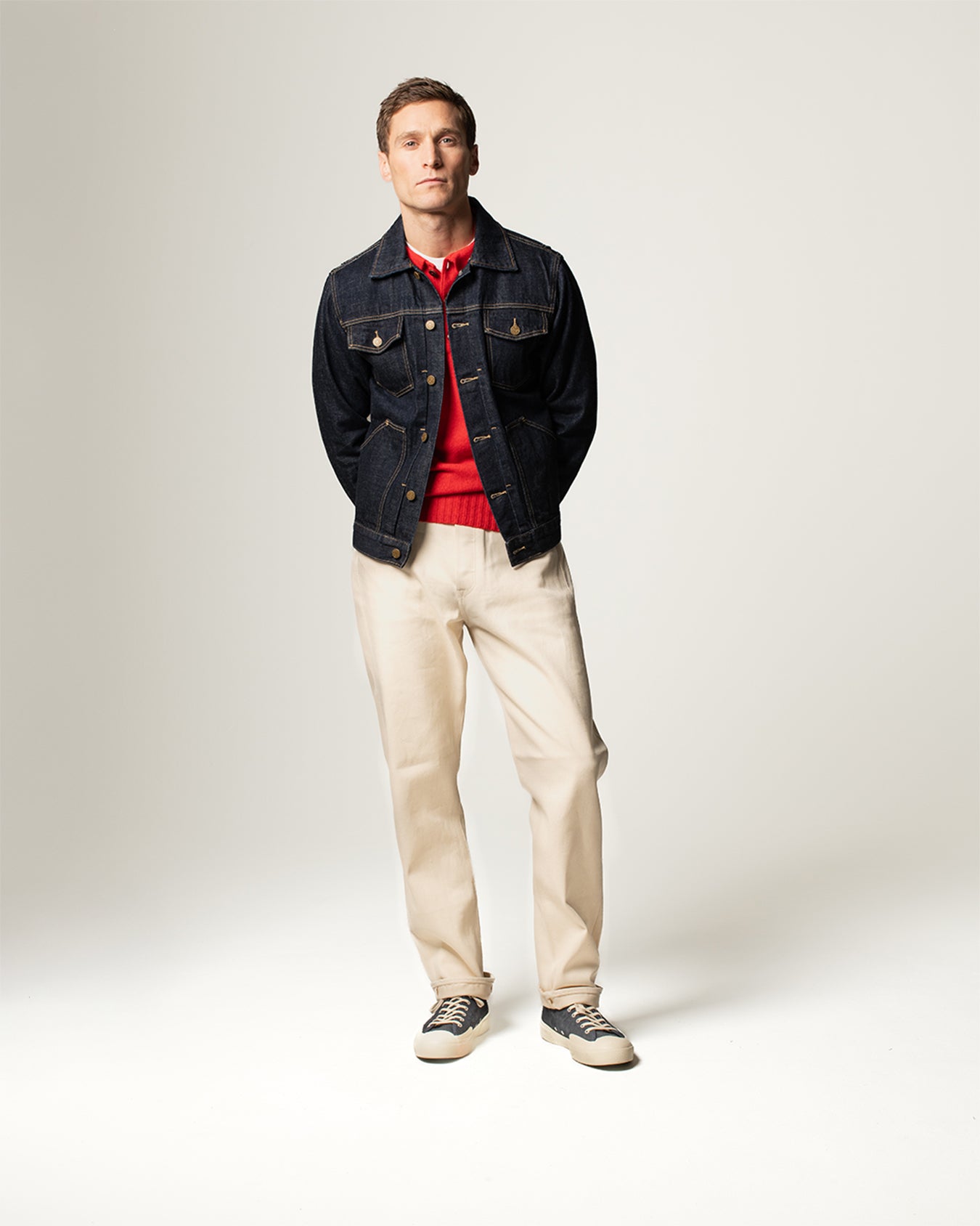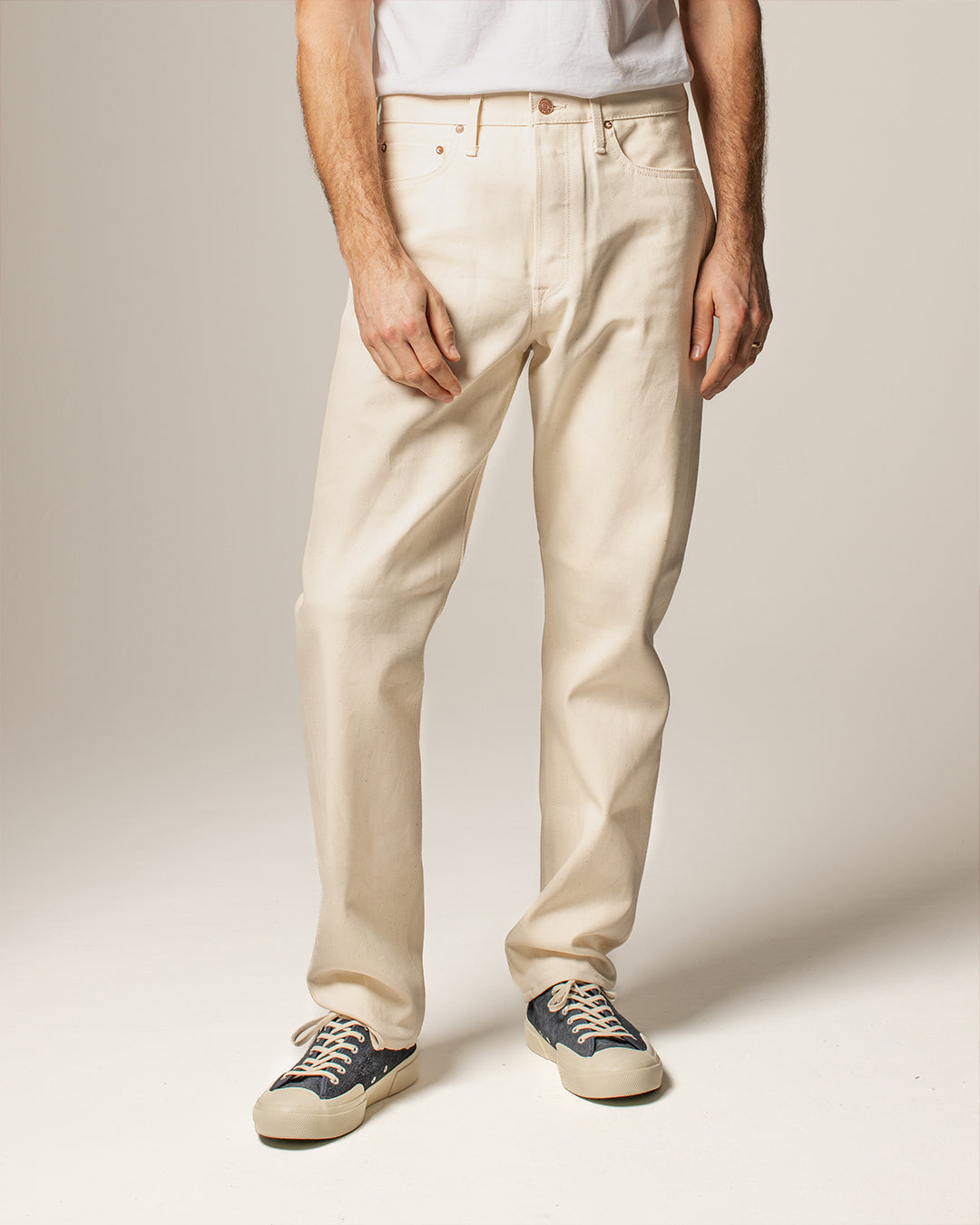 The undyed ecru denim offers a refined alternative to indigo, pairing effortlessly with everything from chambray and knitwear to tailoring. Sewn in Okayama by specialist denim makers, each pair is finished with a classic red selvedge ID, branded button fly, natural leather patch and chain-stitched hems – quiet details that speak to true denim craft.