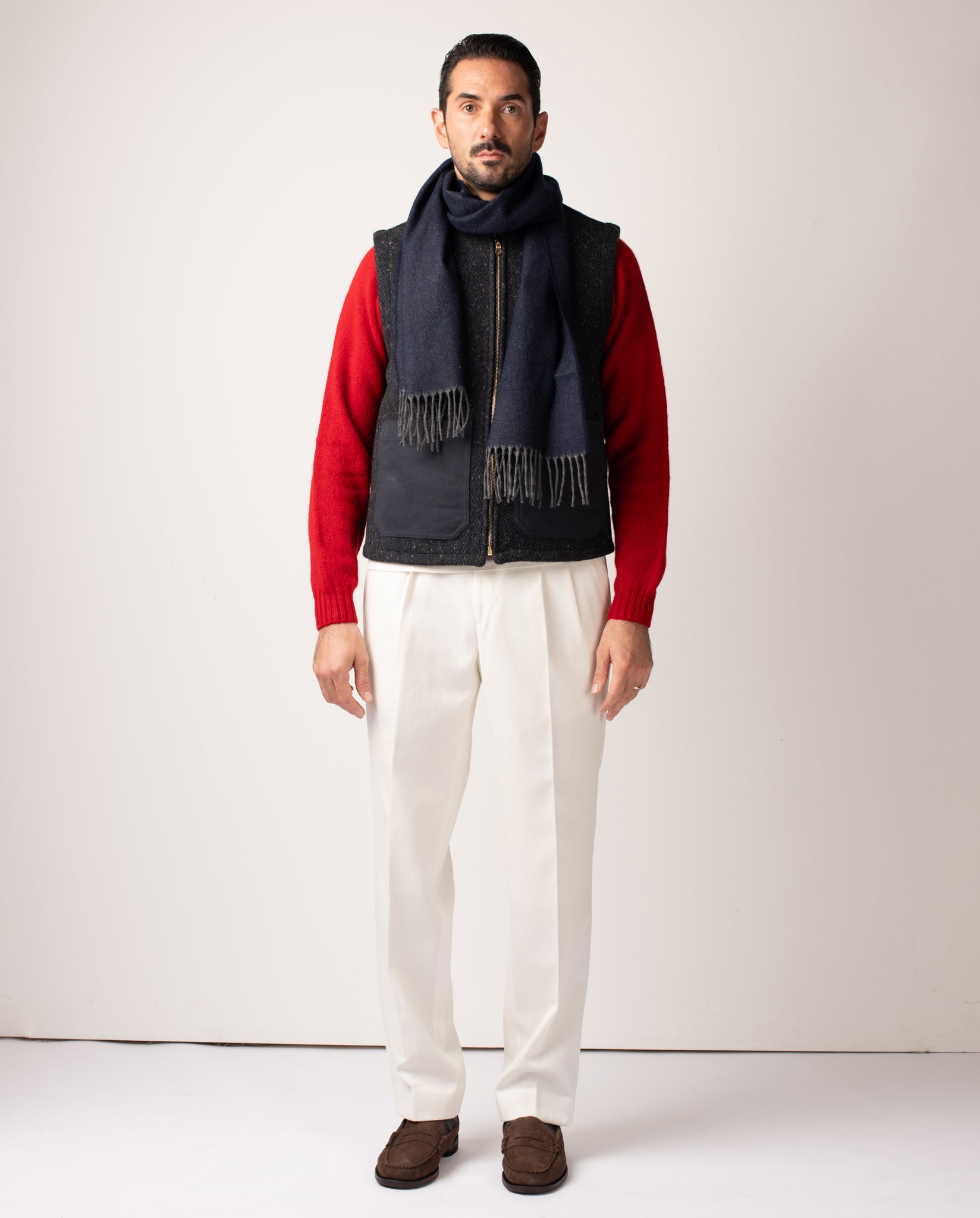 Introducing the Aldworth Gilet in a charcoal Donegal wool - a characterful, textured interpretation of our signature mid-layer. Refined yet full of quiet personality, this version brings depth and tactility through traditional Donegal yarns, spun and woven in the North of England by a heritage mill celebrated for producing authentic British woollens for over a century.