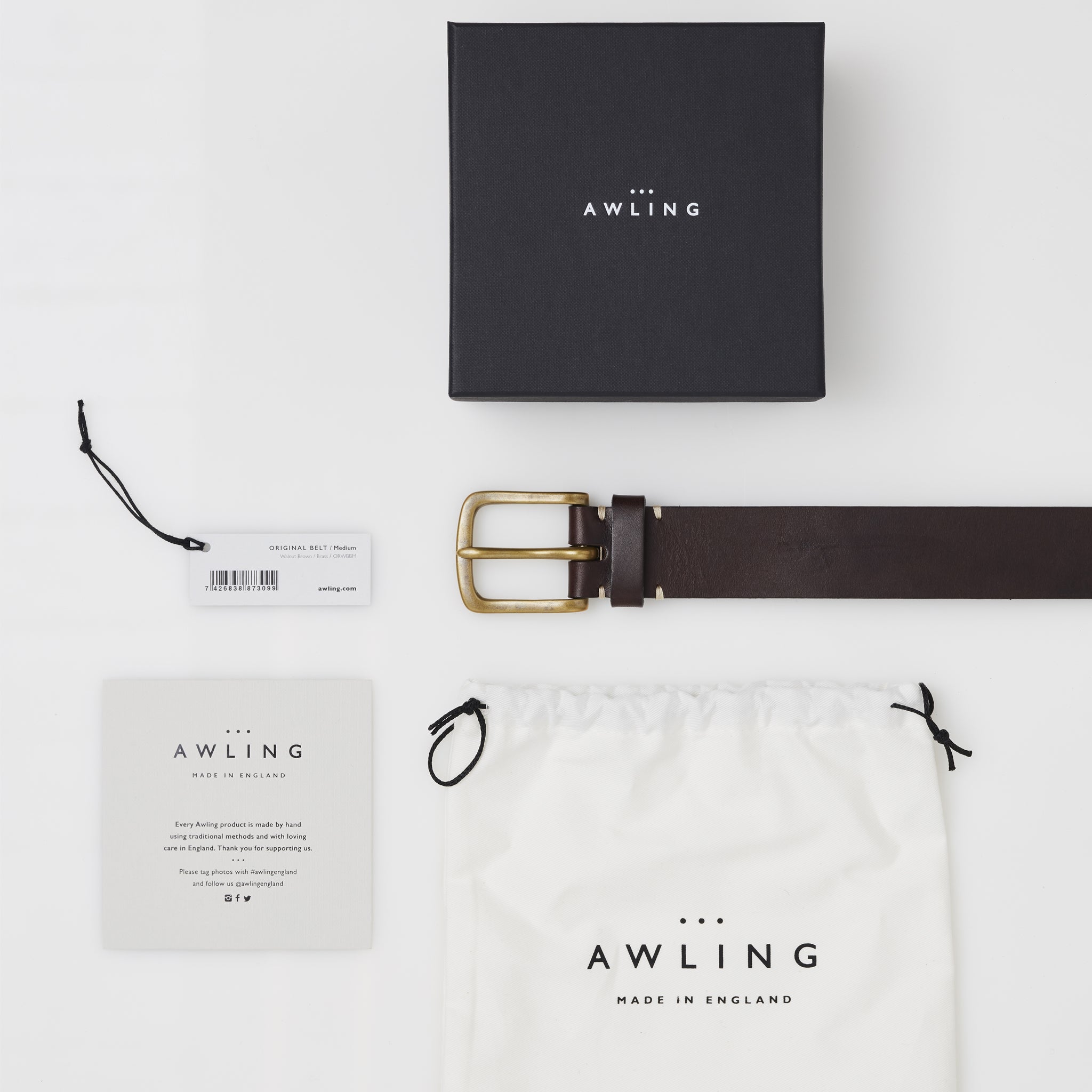 Please note, Awling belts are sized accurately. If you are unsure of your size either measure an existing belt (from the point where the strap folds over the buckle to the hole you use most frequently) or measure your waist through the belt loops of jeans or trousers.