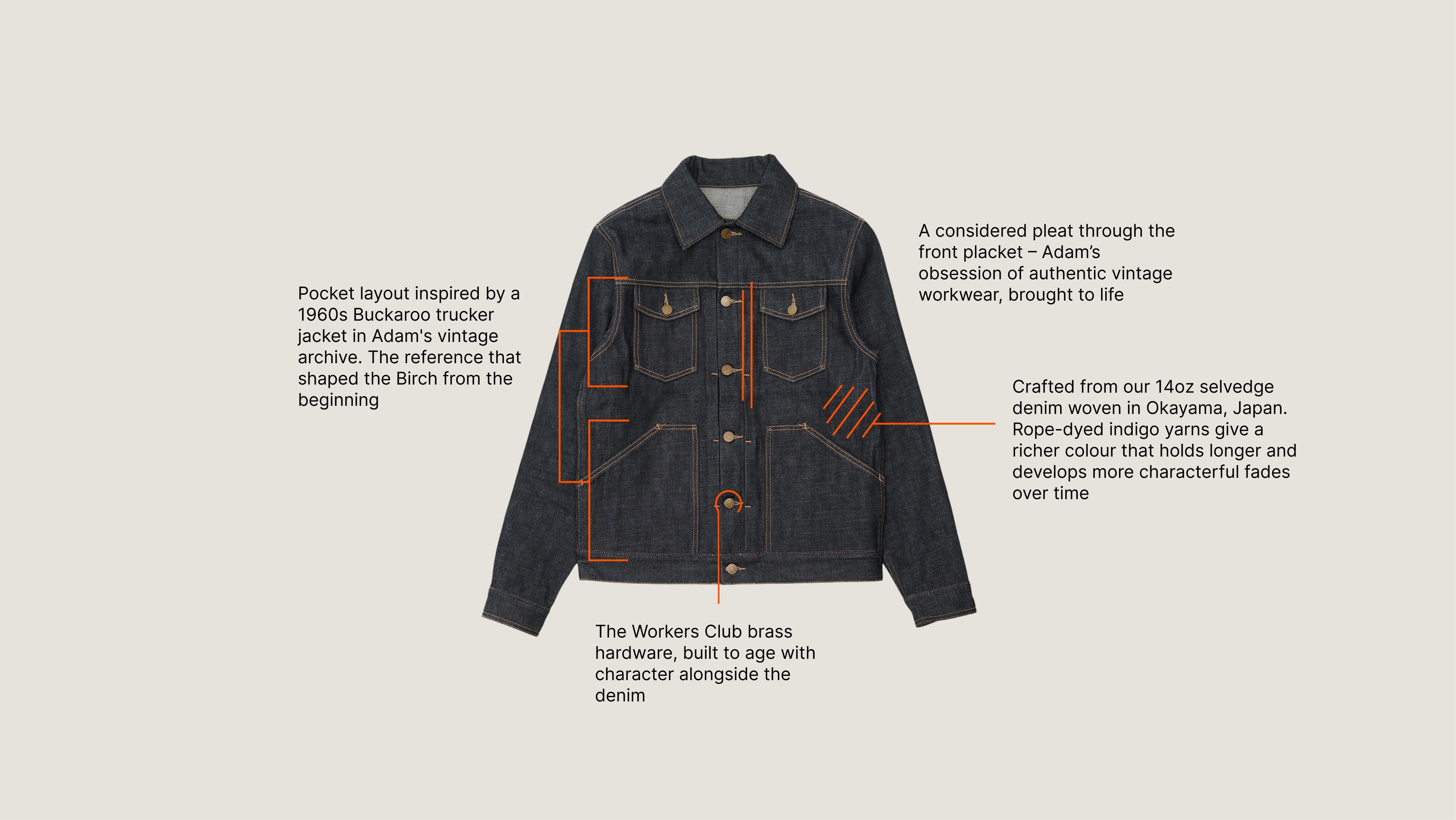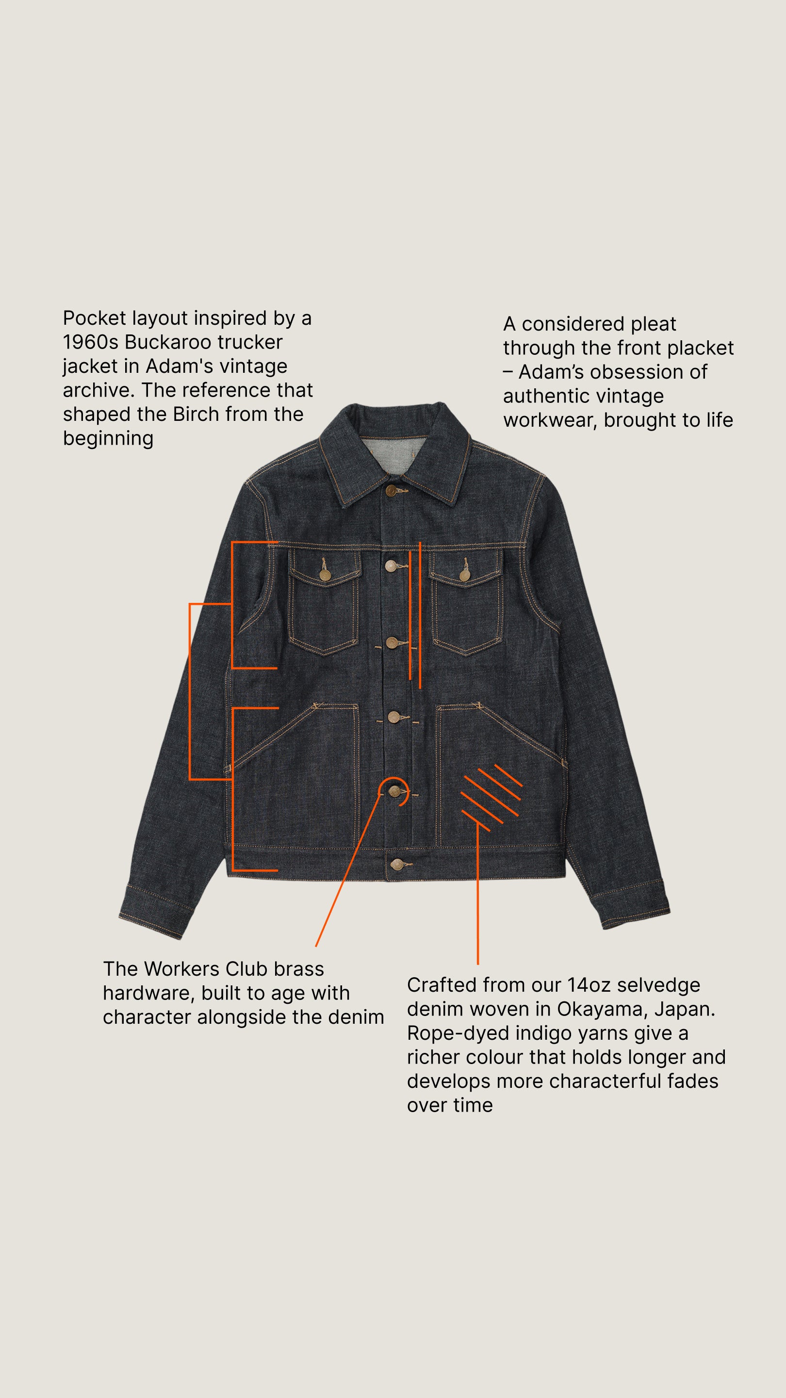 The Birch is 14oz raw indigo selvedge denim woven on narrow looms by Collect Mill, Japan. The denim jacket, refined – cut closer to the body than a traditional trucker, it holds its own over a t-shirt with clean lines and no excess. When the weather changes, the streamlined shape layers naturally under a shell without bulk. Workwear heritage, modern sensibility. Raw indigo that fades and fades with wear – every crease earned, every mark yours. Firms up on day one, softens and moulds over time. Finished with a Sashiko-stitched interior pocket, branded brass hardware, and chambray detailing at the cuffs and pocket flaps.