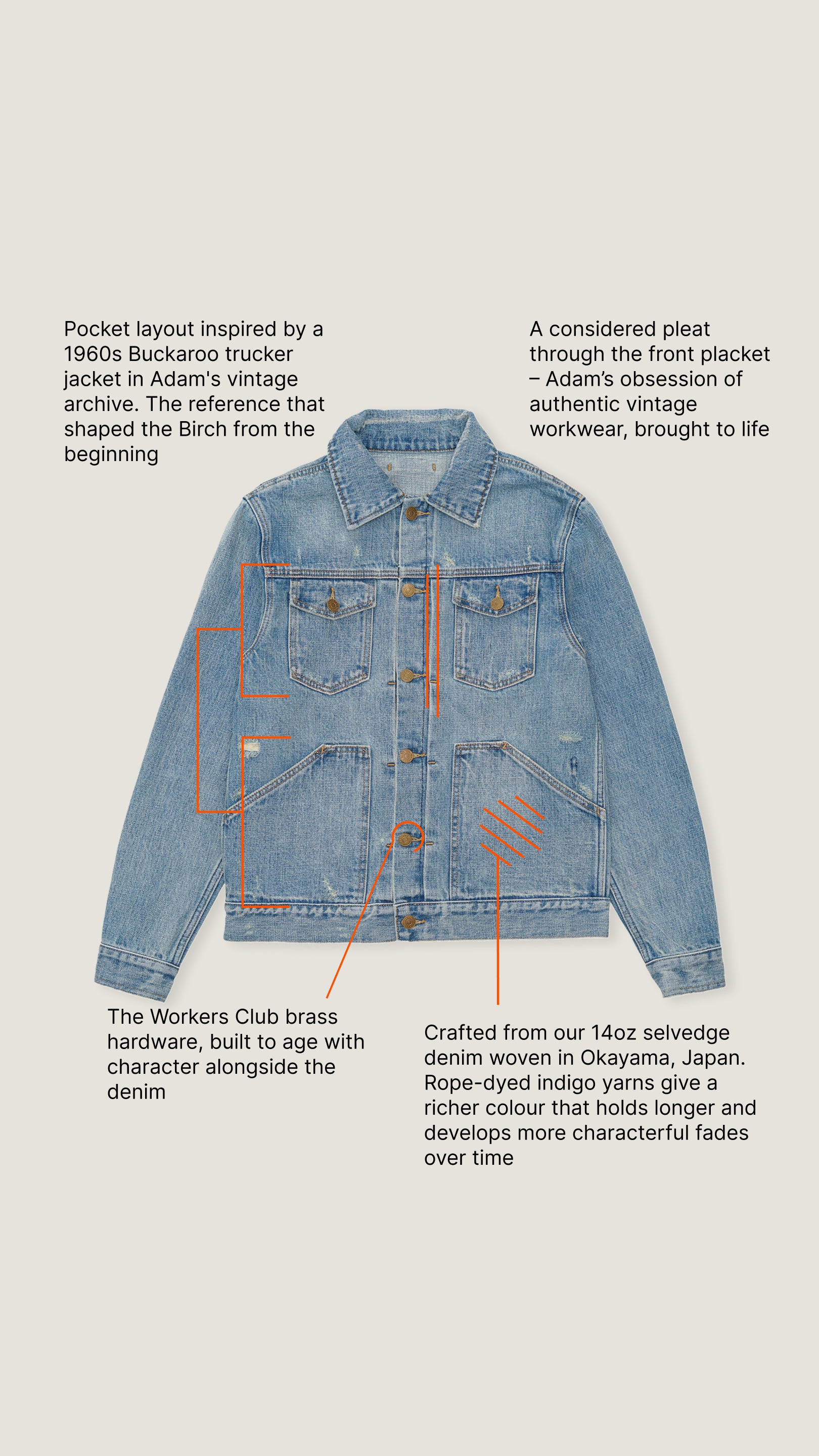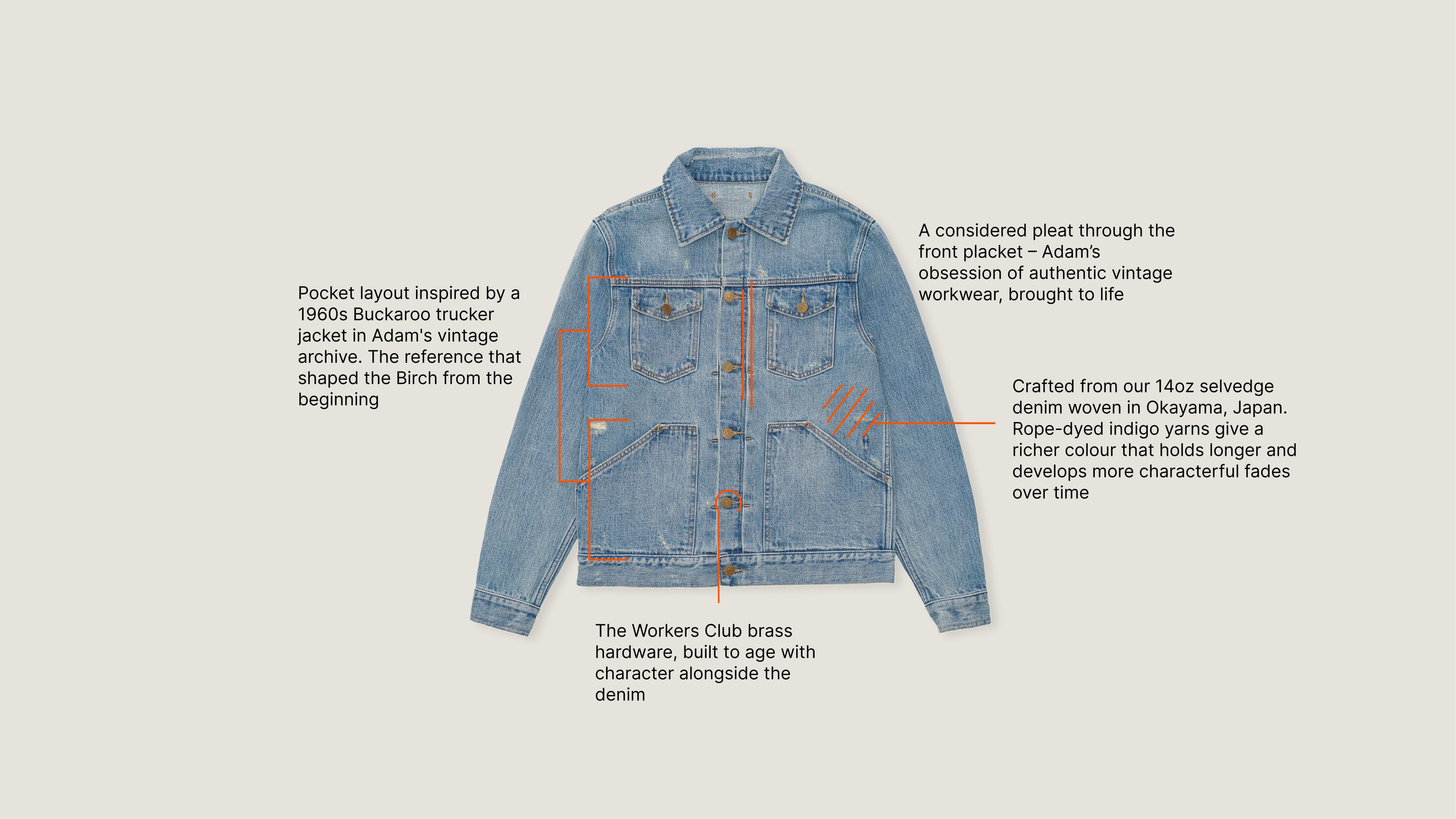 We offer this because we know what goes into making them. Fabric woven on narrow shuttle looms in Okayama. Construction by specialist denim makers. Details that are built to last, not just look good on day one.