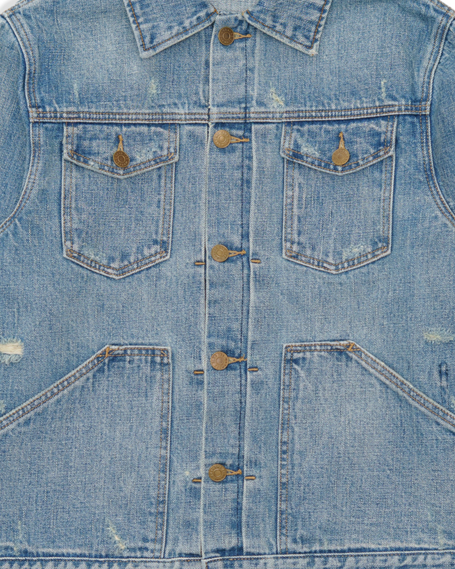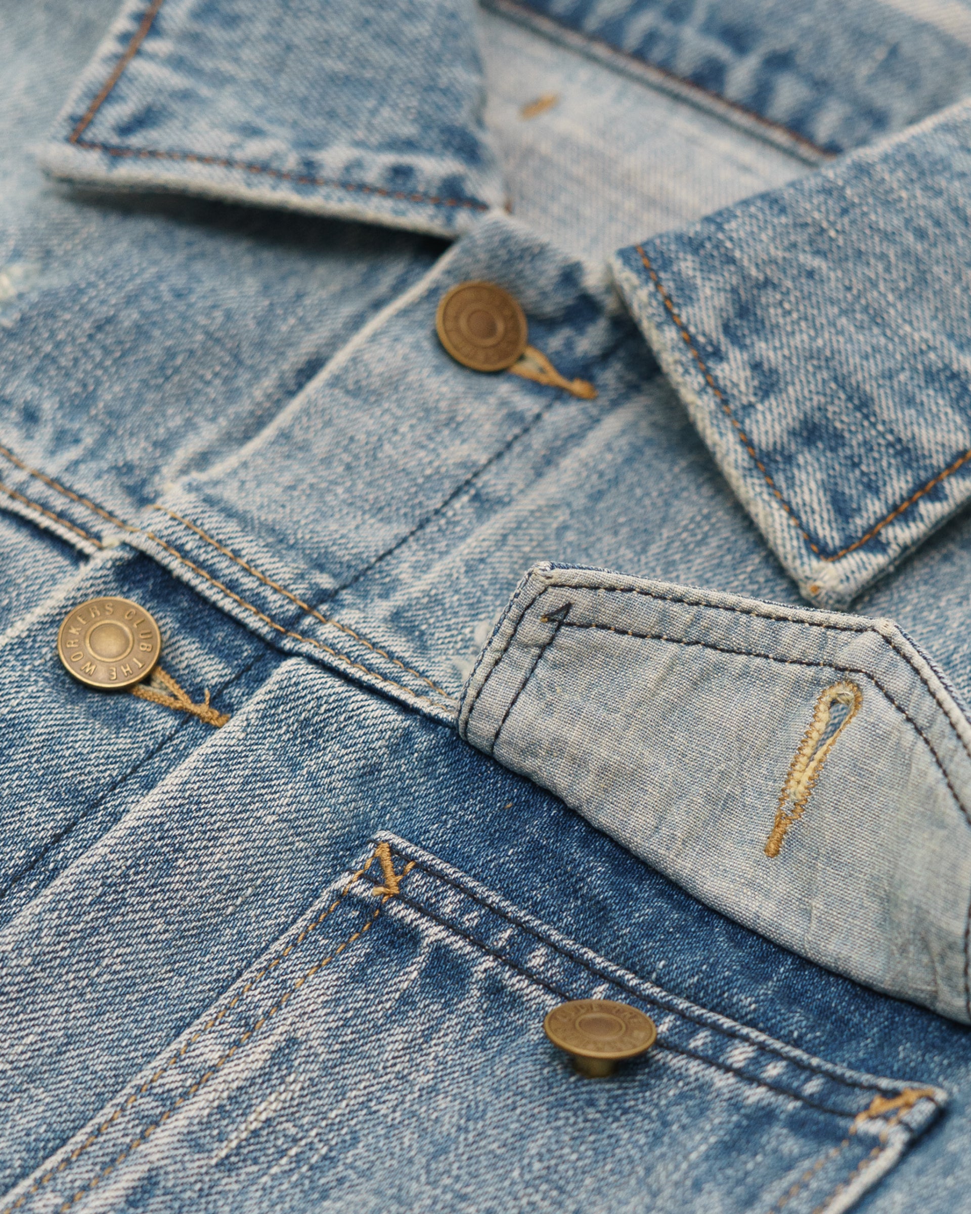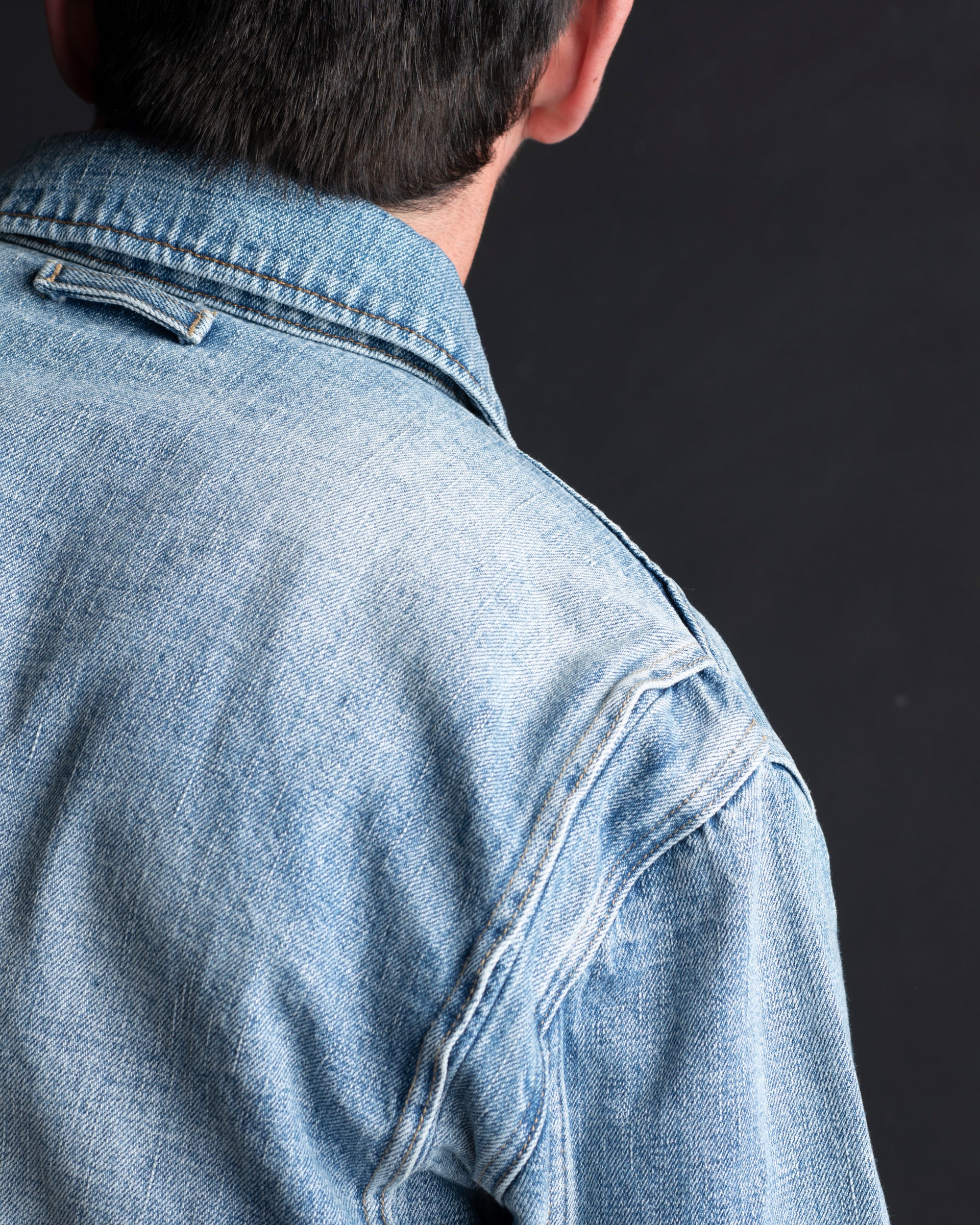 Inspired by one of Adam's favourite pieces from his vintage archive, each jacket undergoes over twenty individual washes using pure spring water and no harsh chemicals. Layer by layer, the indigo is drawn out until the perfect time-worn fade is achieved. From there, every jacket is hand-sanded, whiskered, and given small natural abrasions – placed exactly where they'd appear after years of honest wear.