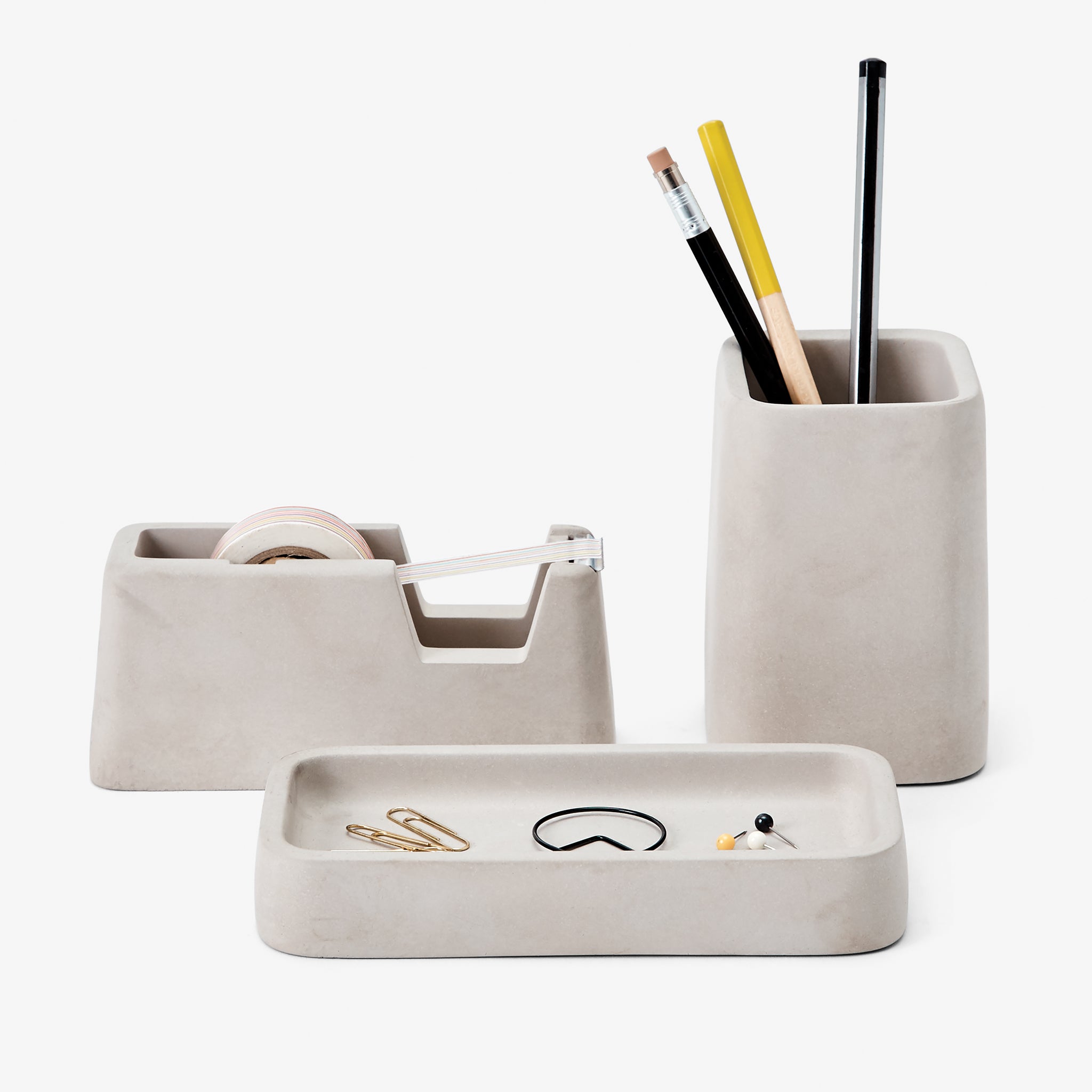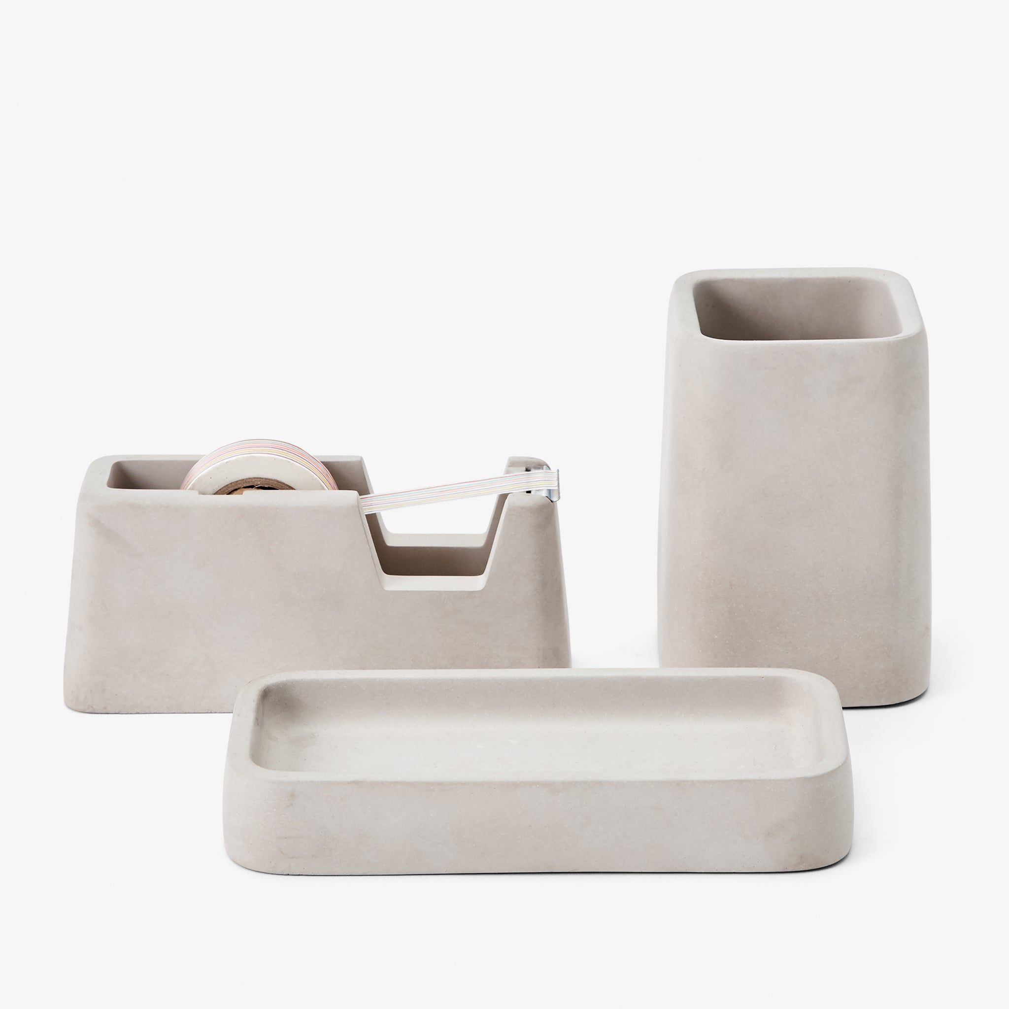 Cast from solid concrete, this set includes a small tape dispenser, pencil holder, and a small tray.