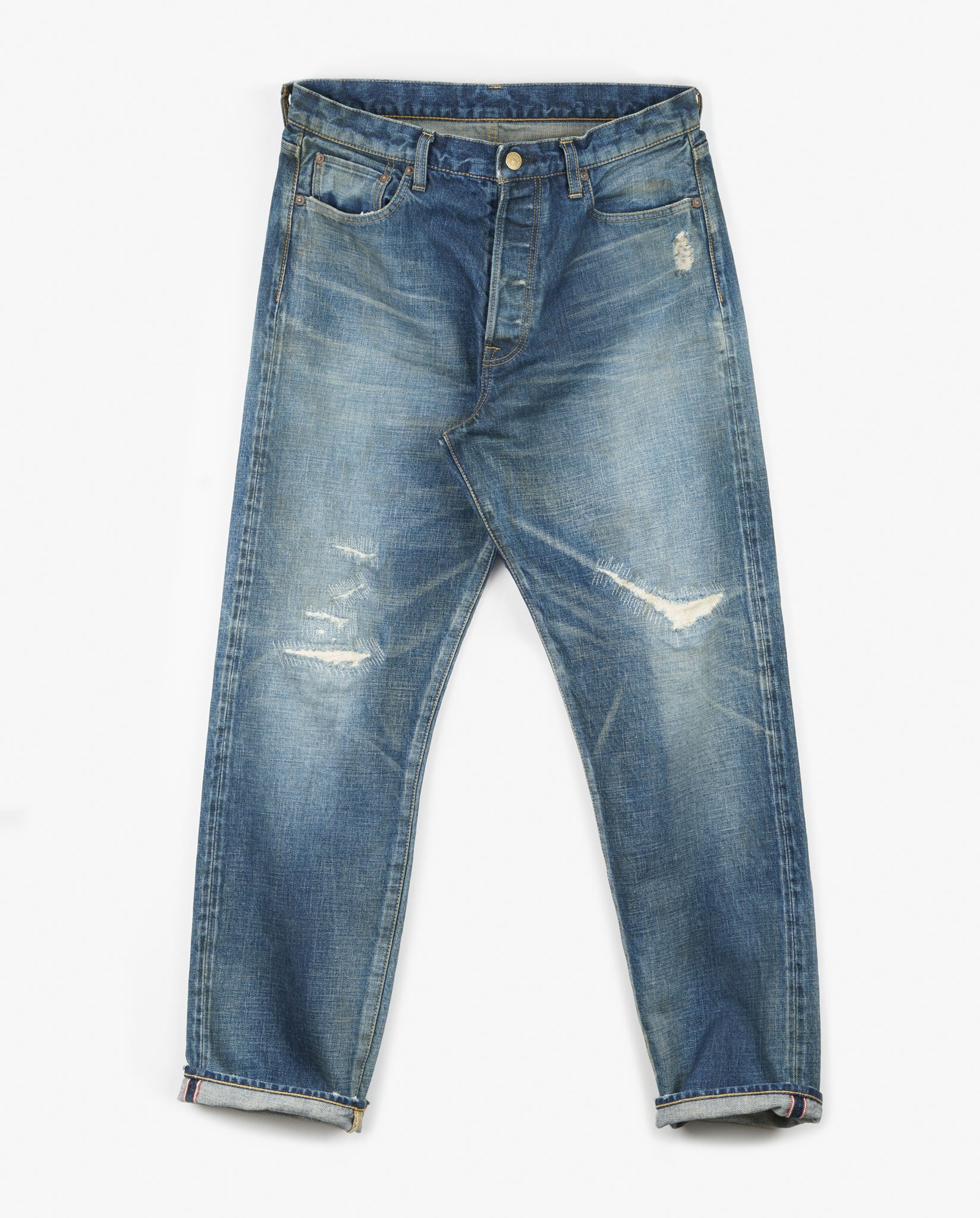 This pair of 007 Relaxed fit jeans have had over 20 washing stages. The whiskers and fades have been applied over many days by hand. This pair feature a large rinse wash denim patch on the wearers left leg, and a tear with reinforced stitching giving an authentic vintage feel. Other hand finished details are the sanding along the rope edge of the back pockets, along the hem edge and at each point where the jean would naturally fade and wear over time.