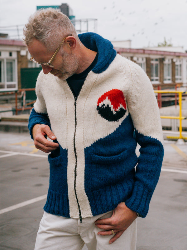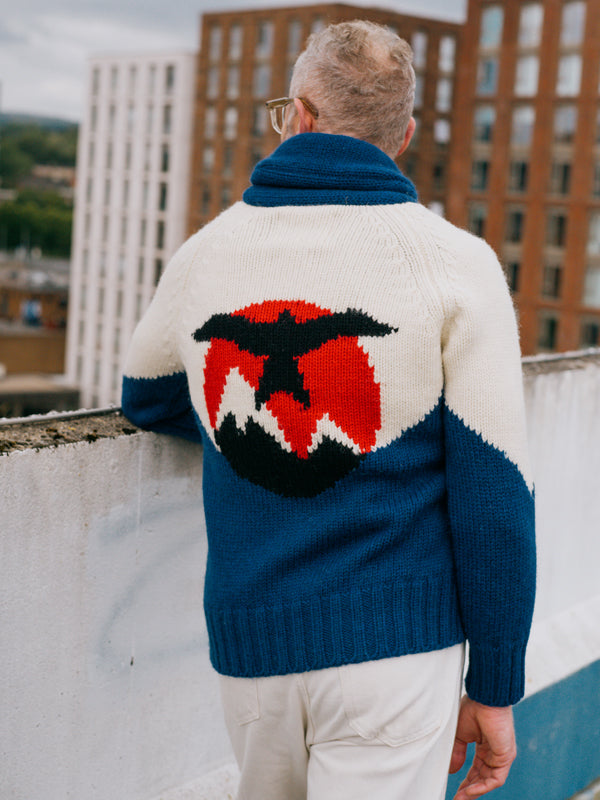 • The Bear Cardi: Hand-framed on a traditional flatbed for a truly personal finish. Archive-inspired colour-block landscape with our Red Kite in flight; 100% Welsh wool in chunky 3-gauge. Shawl collar, rib cuffs, and a two-way RiRi zip; substantial enough to wear as outerwear. From £1250