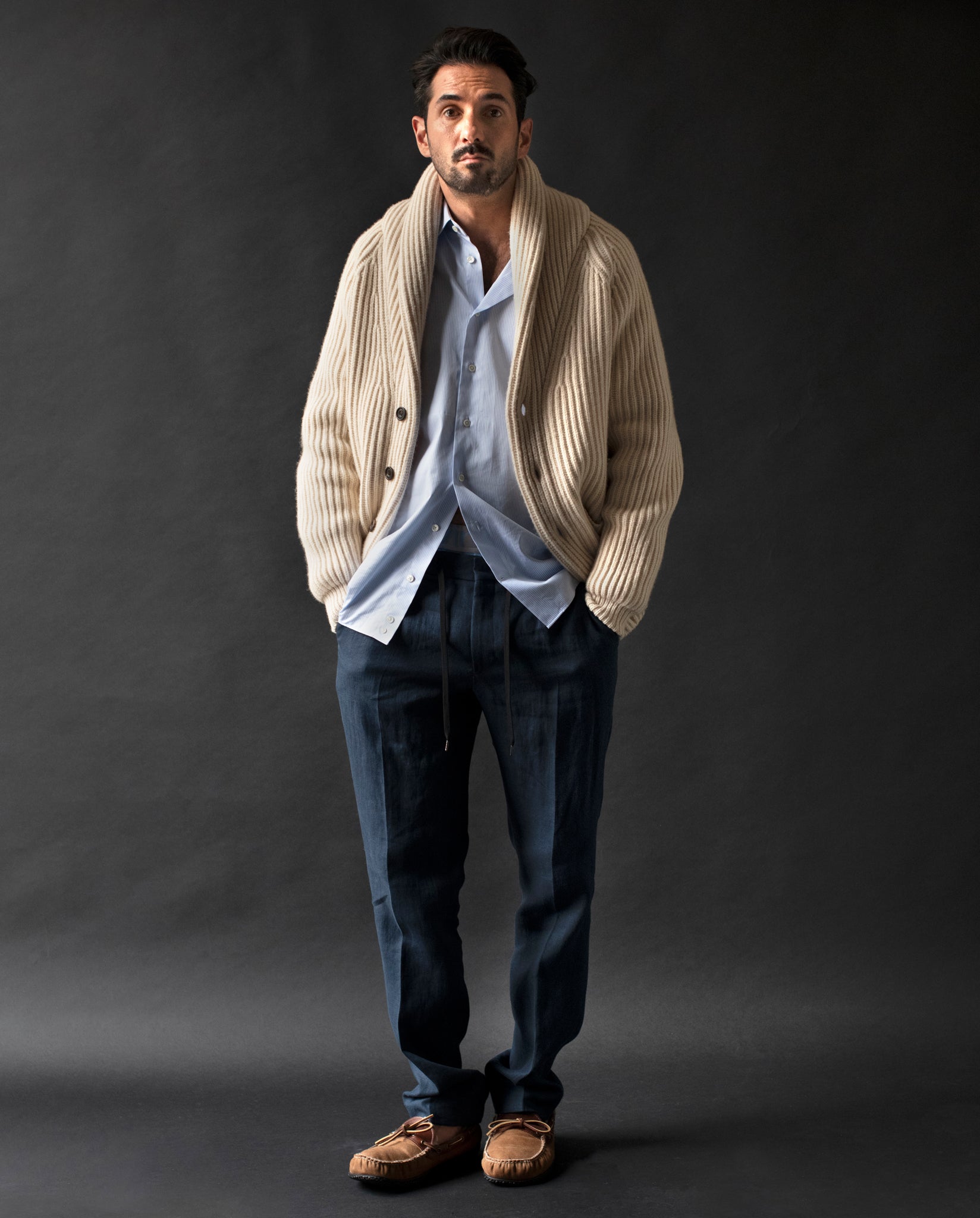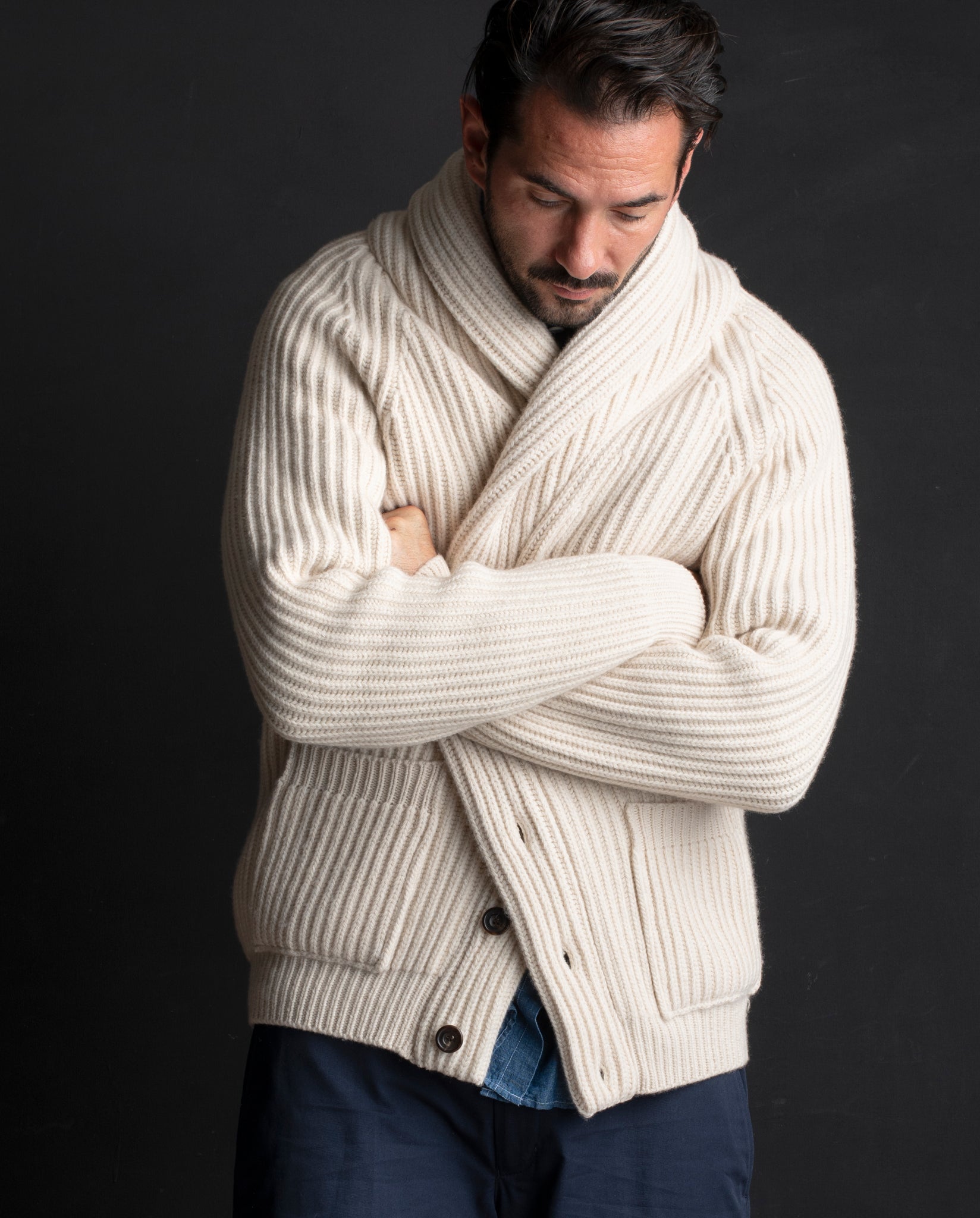 • Pembrook Shawl Cardi: 2.5–3 gauge, 6-ply, double-knit shawl collar, two patch pockets, horn buttons. Weighty, warm, and available in wool or cashmere. From £895