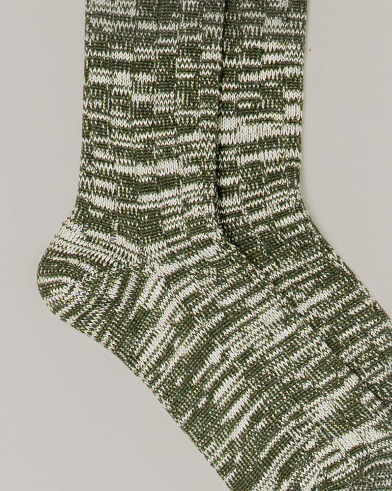 Knitted in a fine green and cream marl merino, these socks balance softness with performance. Merino regulates temperature, resists odour and wicks moisture, keeping feet comfortable from morning to evening. The subtle marl adds depth, and the hard-wearing knit ensures long-lasting shape and resilience.