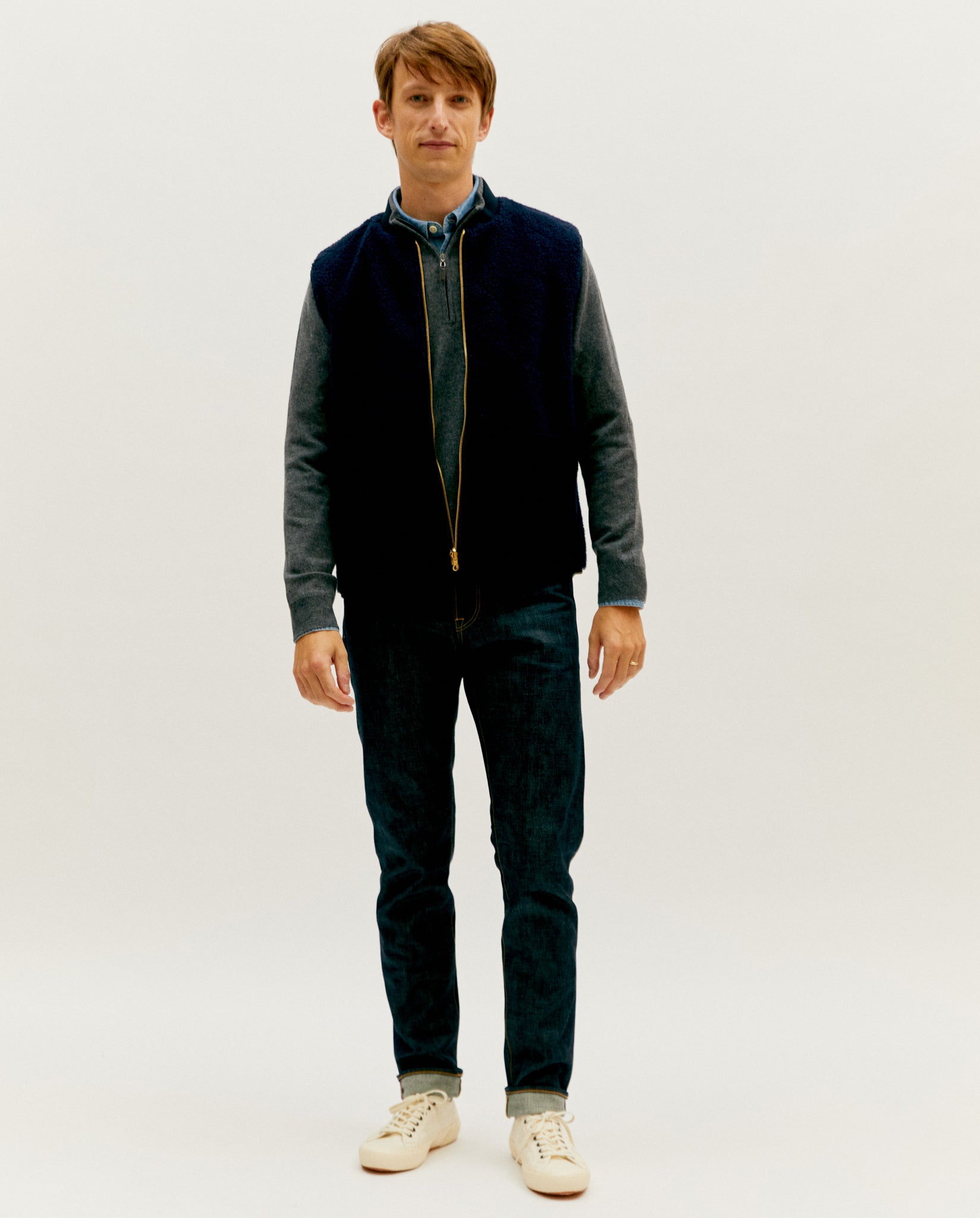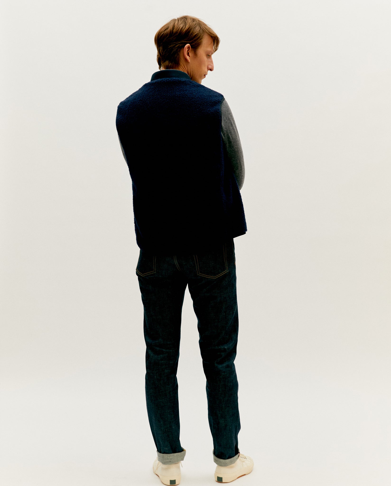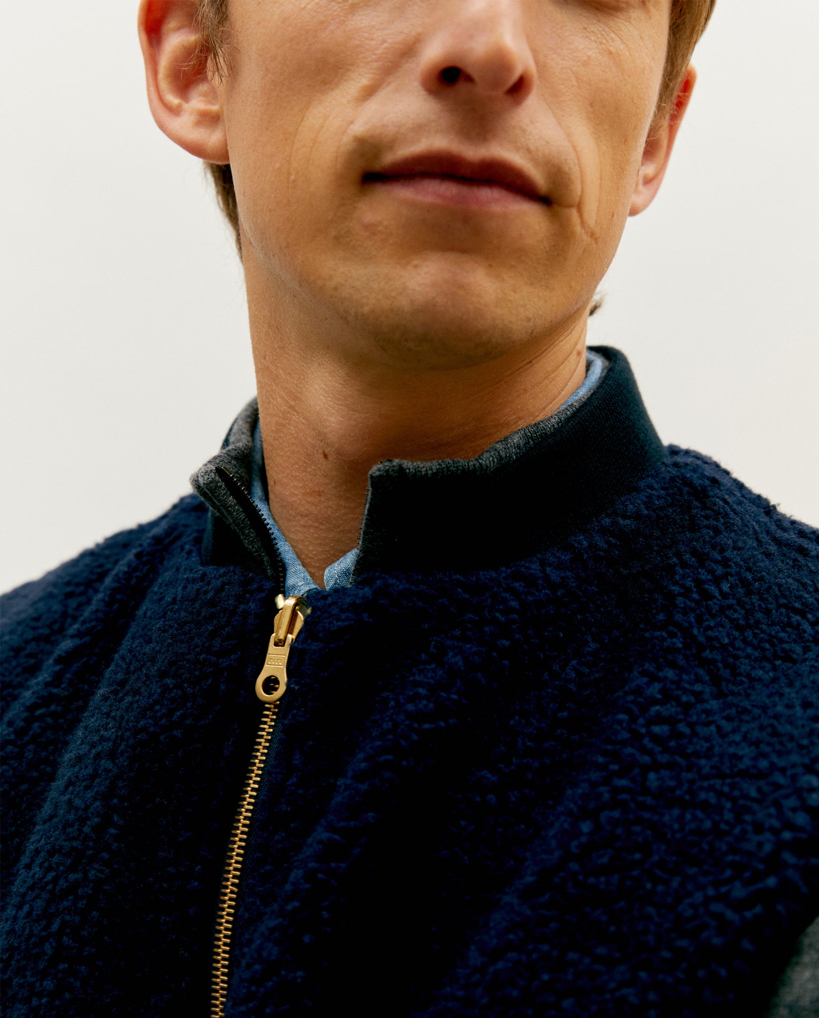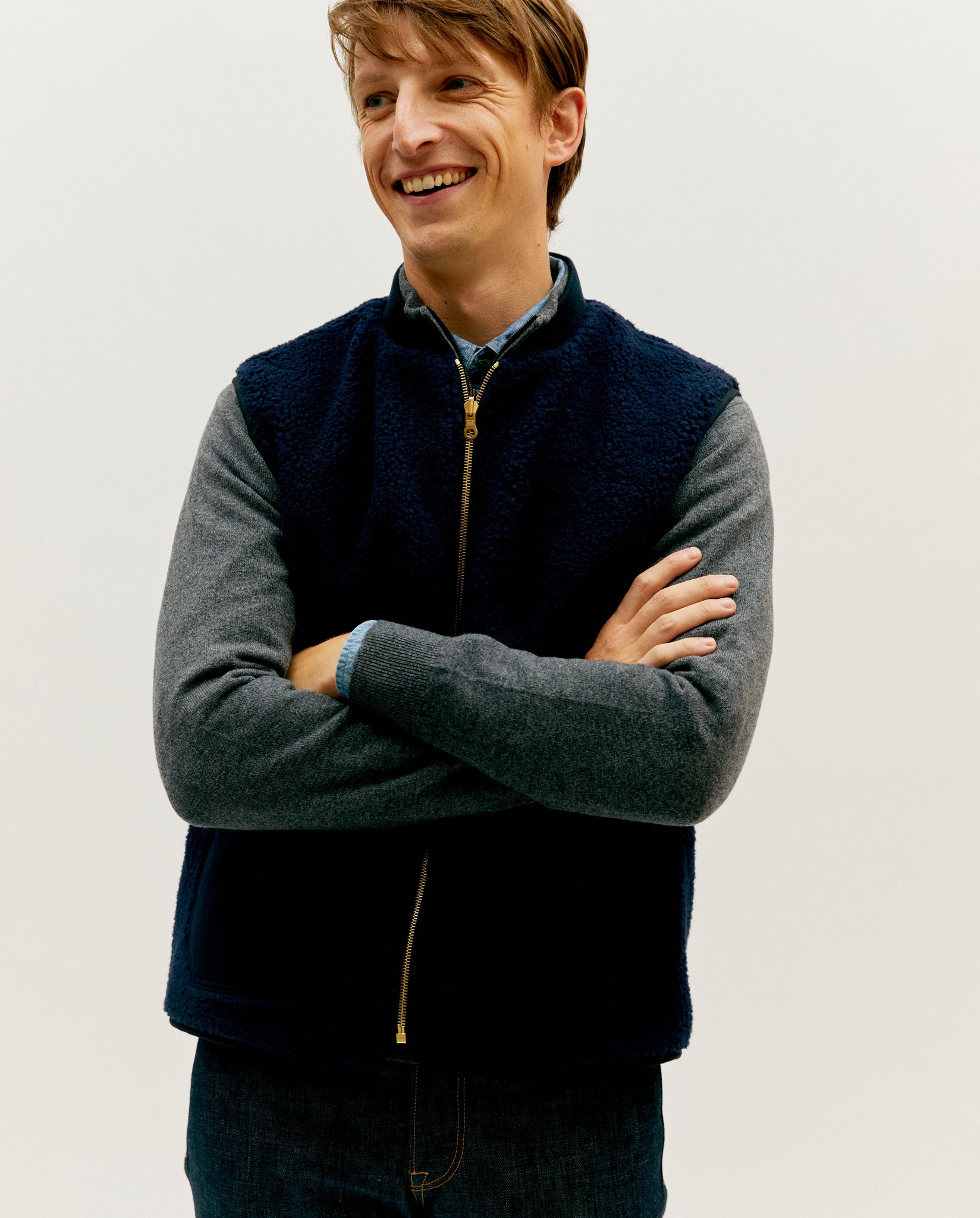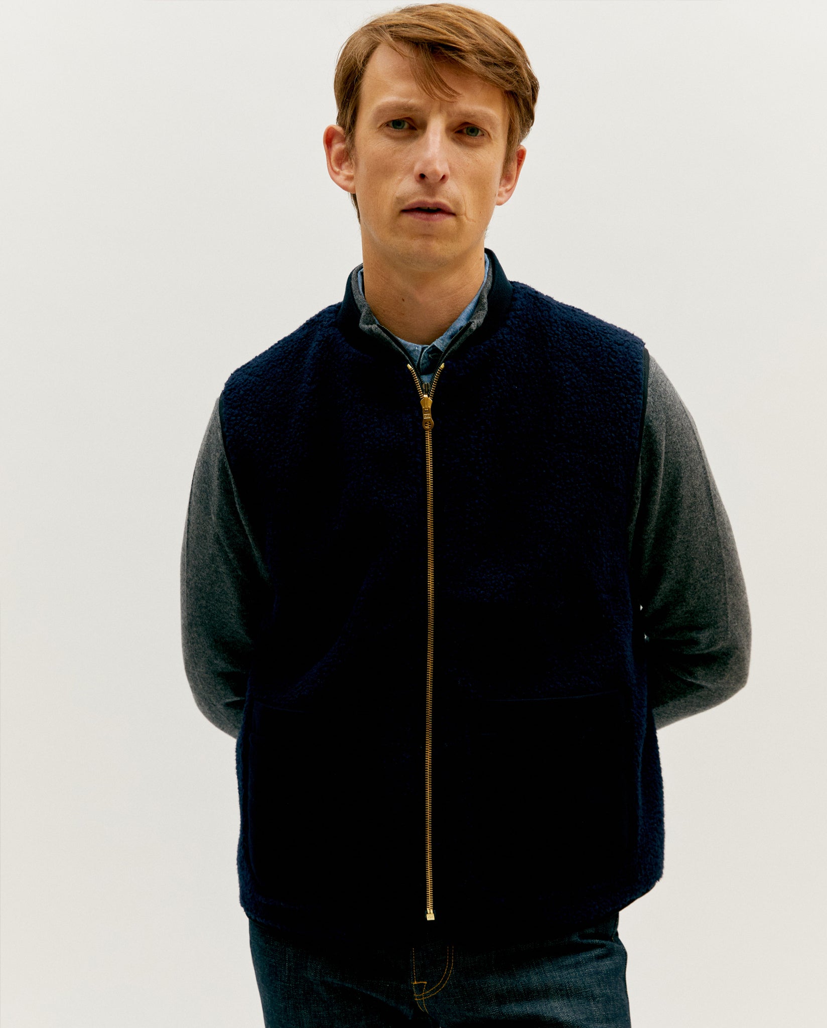 This gilet is crafted from an exclusive navy teddy polyester fleece that's as soft as it is stylish and warm