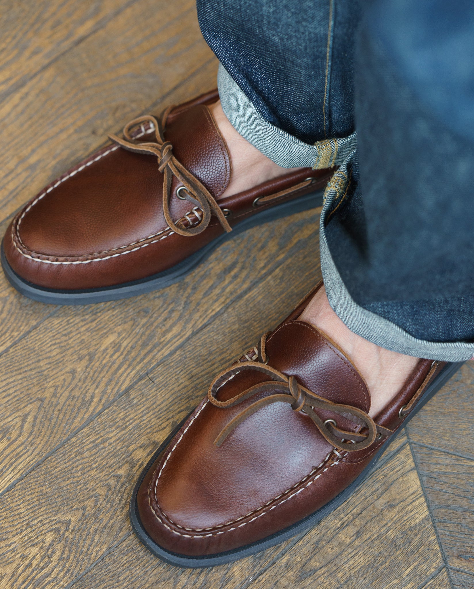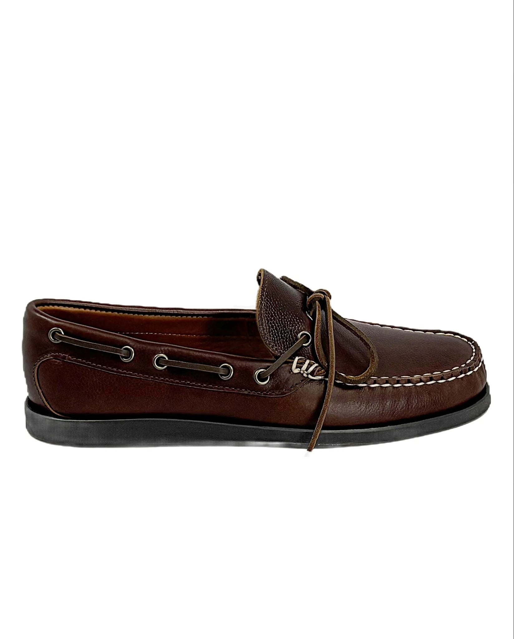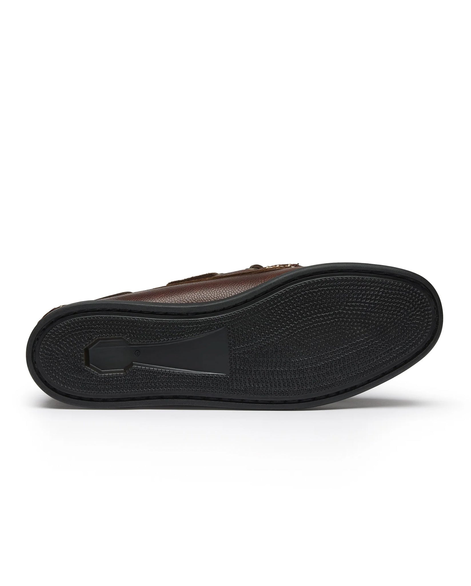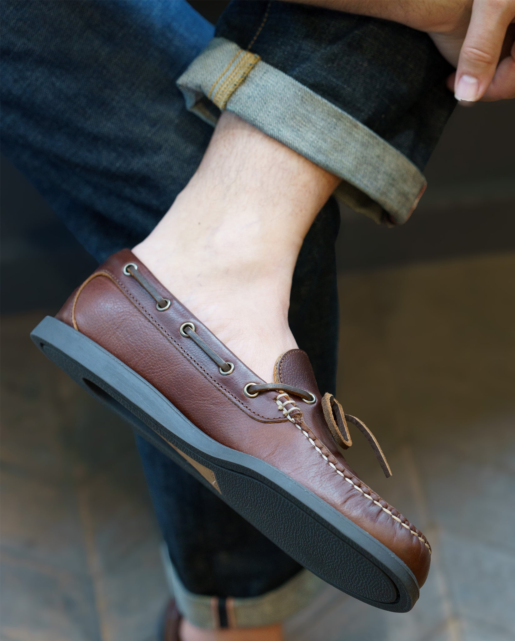 A true American classic, the Quoddy Canoe Shoe is the brand’s signature silhouette - inspired by traditional moccasin construction. This edition is made from brown pebbled leather - richly textured, incredibly durable, and treated with a pull-up process that enhances its natural sheen and creates subtle colour variations unique to each pair.